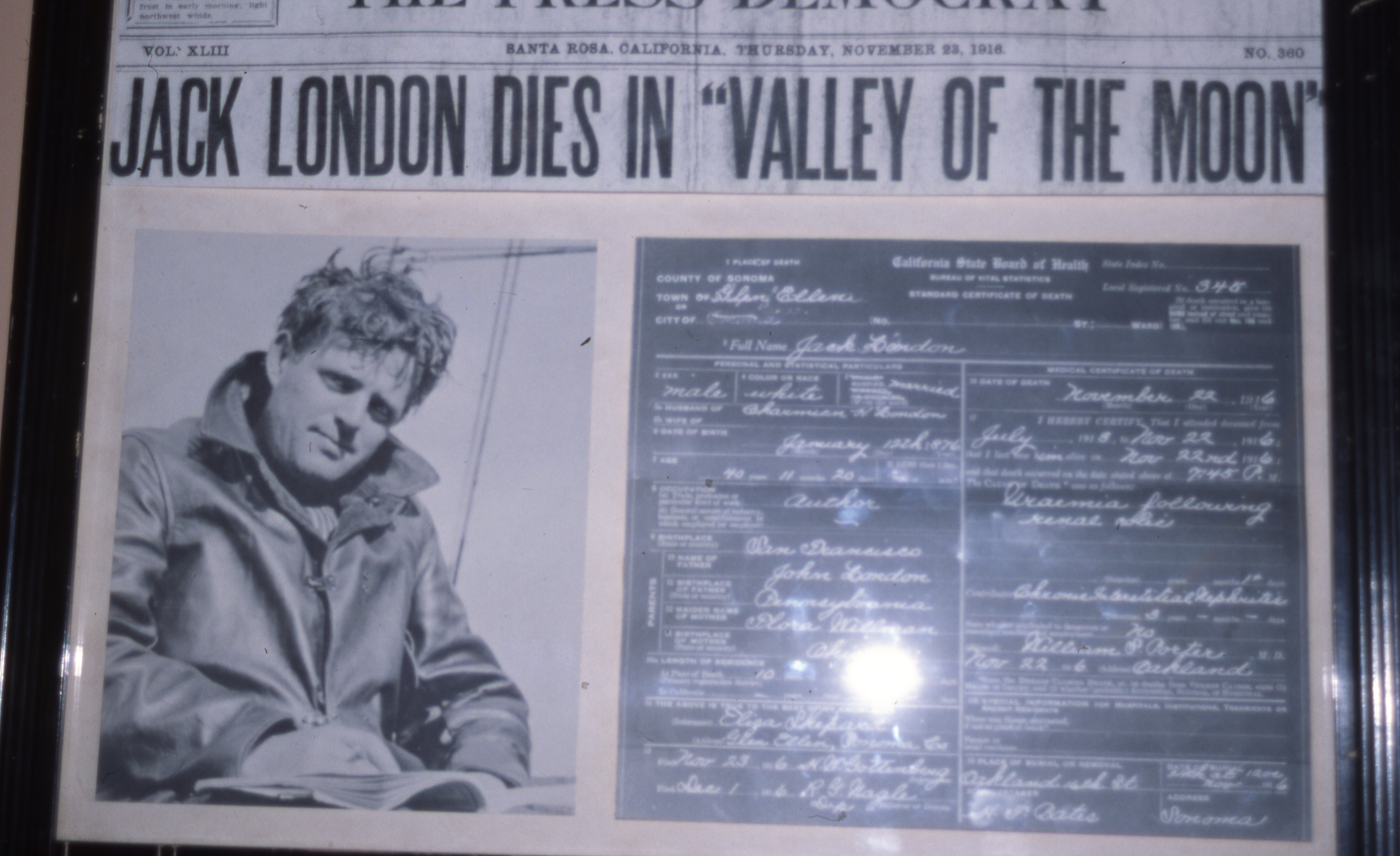 Ses publications -plus de trente volumes- lui permettant de vivre dans l’aisance, il acquiert à Glenn Ellen dans la Sonoma Valley, un ranch où il fait construire une immense maison (Wolf house) qui brûlera en une nuit. Jack London meurt à 40 ans après une vie extrêmement remplie d’expériences multiples sous tous les horizons. Il est enterré sous un énorme rocher à proximité de Wolf house.