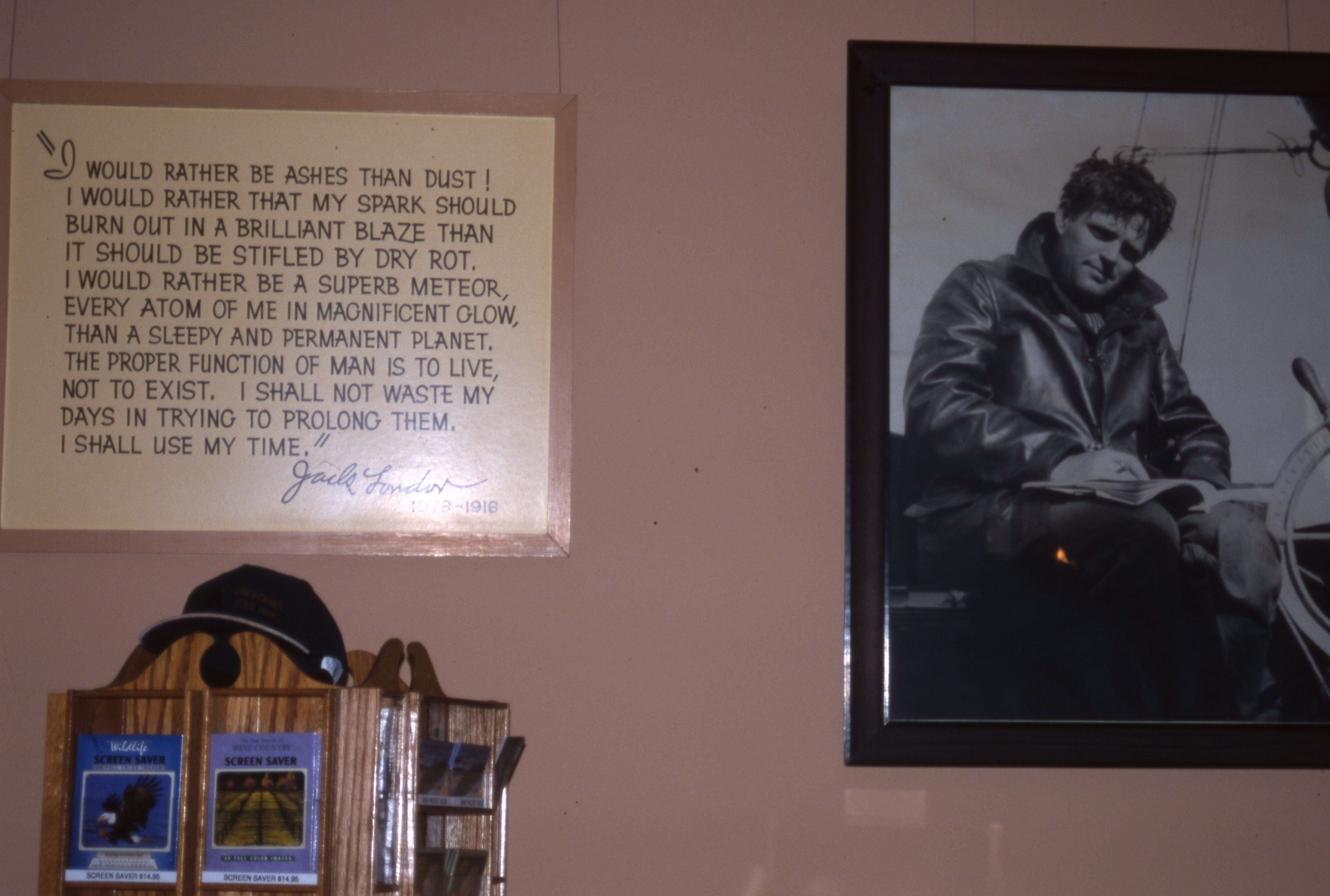 L’immensité de son ranch lui permettra de mener des expériences agricoles (agriculture biologique avant l’heure) et notamment la culture de la vigne. Fasciné par la vie cet auteur, Bonum Vinum est allé à Glenn Ellen en 2000 et il a visité ce vignoble californien qui existe toujours sous le nom de Kenwood Vineyards. Cela n’a rien à voir avec nos vignobles traditionnels où le contact avec le récoltant est essentiel. C’est une véritable entreprise avec boutique de souvenirs, accueil par des employés peu compétents, dégustation payante (mais on revient quand même avec le verre en guise de souvenir). Le vin, issus des cépages français les plus connus, s’est avéré lourd et sans finesse pour un prix élevé à l’époque. Ce vignoble se qualifie aujourd’hui d’agriculture durable. Une visite sur le site internet est intéressante, on y trouve des références à Jack London.